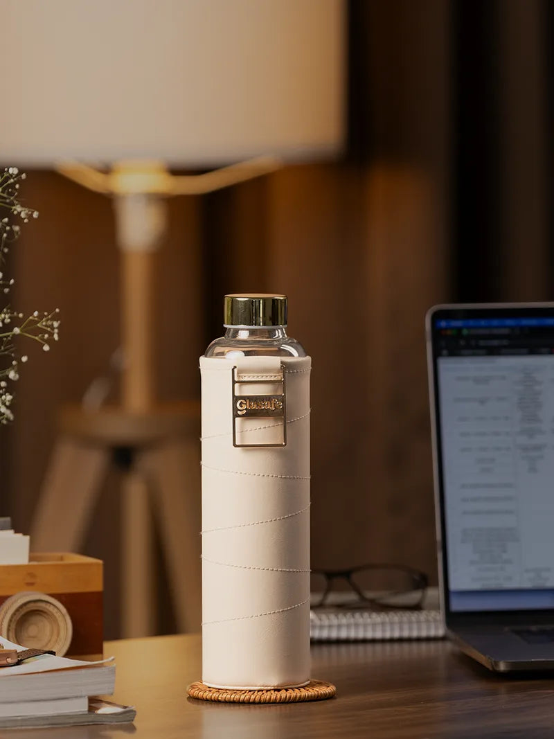 Glasafe Vego Sip Borosilicate Glass Bottle with Protective Vegan Leather Sleeve, 750ml (Bare Beige)