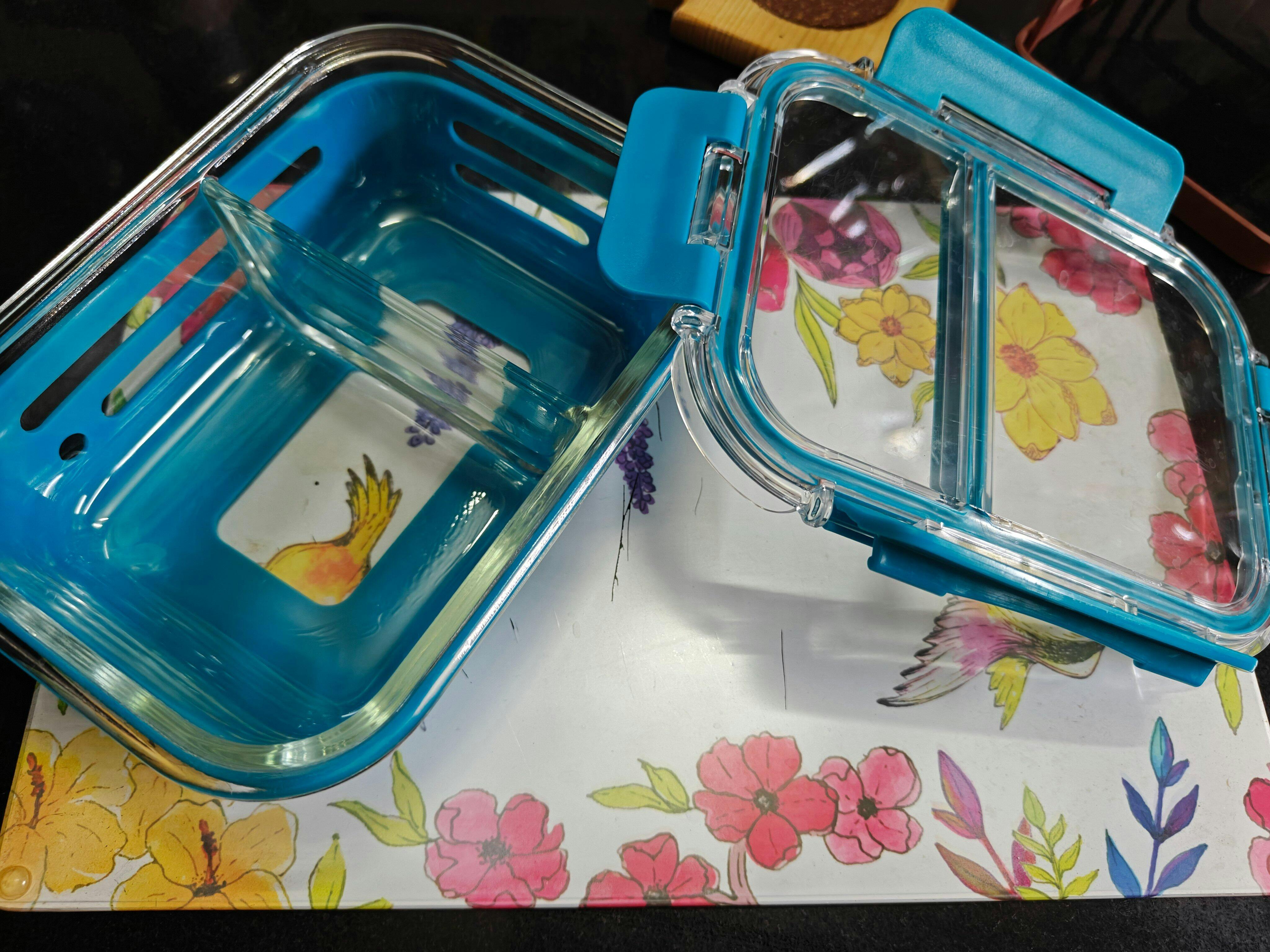 The high-quality borosilicate glass lunch box has compartment to ensure you can carry your favourites everywhere. This compartment glass tiffin ensures food safety and is entirely BPA-free, keeping your meals nutritious and uncontaminated for hours. The 2 section glass box has a silicone sleeve that adds an extra layer of protection while the airtight top lid with clip locks on all four sides offers leak-proof transportation. The two partition glass tiffin box has distinct compartments so you can pack 2 different foods in one container without their flavours mixing together. For hassle-free heating of meals, this compartment lunch box is microwave safe. This tiffin box is highly versatile and can be your go-to lunch box for office.