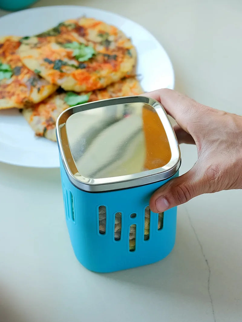 - Protective silicone sleeve that keeps your containers safe from bumps and drops.