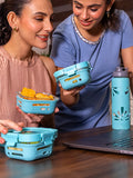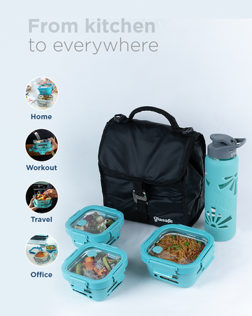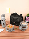 Meet the ultimate lunchware set: a chic collection of tiffins, a bottle for hydration, and a sleek, durable bag—all designed to fit your busy lifestyle. The airtight tiffins keep your food fresh, the bottle ensures hydration on the go, and the bag brings it all together for easy, organized commuting.