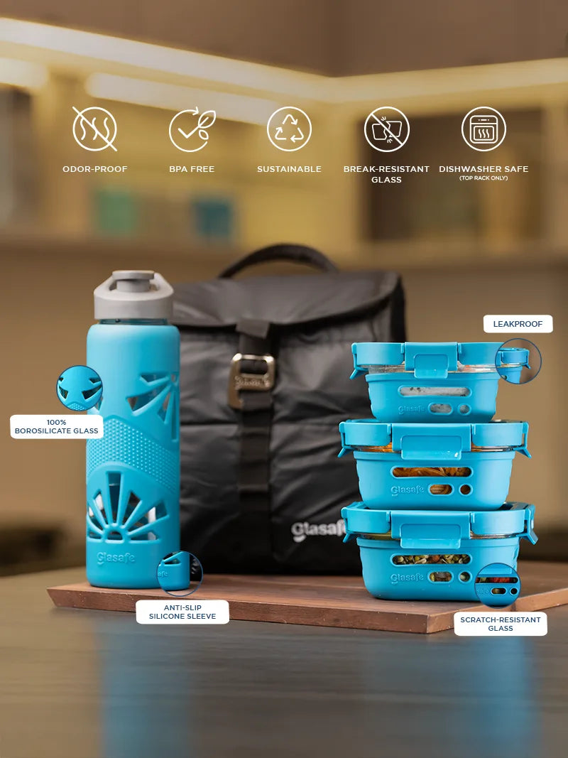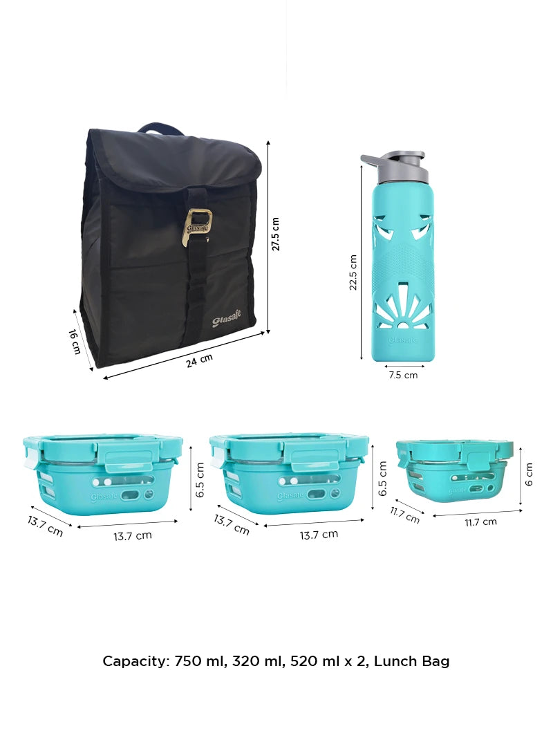 Glass Lunch Box Combo For Office with Air-Tight Glass lid & Silicone Sleeve (Tiffin: 320x1 + 520x2, Bottle, Bag)