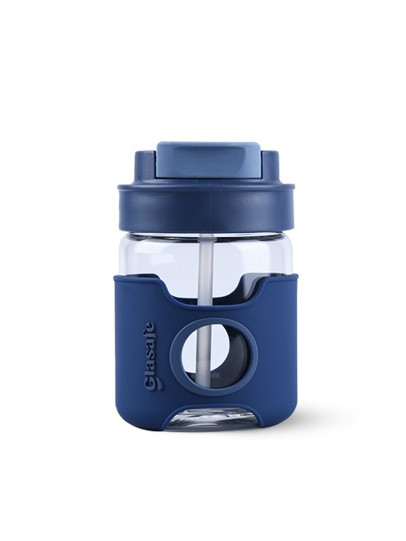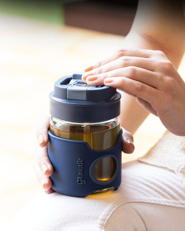 Glass Travel Tumbler with Silicone Sleeve & Dual-Flip Cap – 360ml (Midnight Blue)